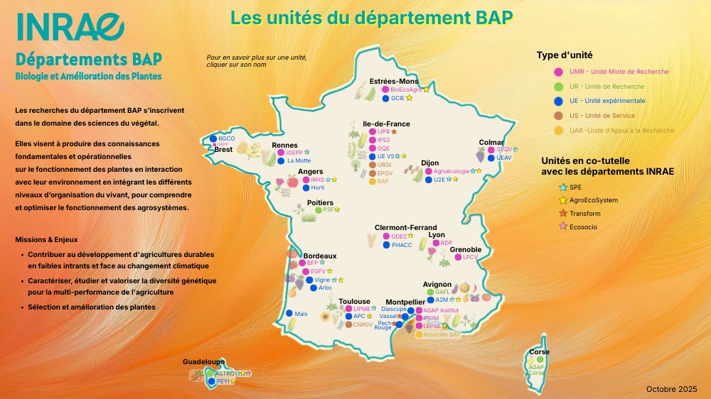 Les recherches du département BAP s’inscrivent dans le domaine des sciences du végétal. Elles visent à produire des connaissances fondamentales et opérationnelles sur le fonctionnement des plantes en interaction avec leur environnement en intégrant les différents niveaux d’organisation du vivant, pour comprendre et optimiser le fonctionnement des agrosystèmes.