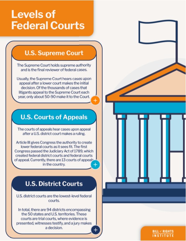 U.S. district courts are the lowest-level federal courts. In total, there are 94 districts encompassing the fifty states and U.S. territories. These courts are trial courts, where evidence is presented, witnesses testify, and a jury makes a decision. District court judges hold the same power as those on appeals courts and the Supreme Court to strike down laws as unconstitutional through their power of judicial review. District Courts hear tens of thousands of civil and criminal cases each year.