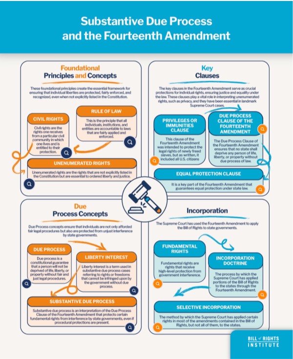 Substantive due process goes beyond procedural fairness and ensures that certain rights, such as privacy or marriage, are deemed fundamental and protected from unreasonable government infringement. Over time, the Supreme Court has assumed a significant role in defining and enforcing these rights, a power that has been subject to debate. Critics argue that the Court may be exceeding its constitutional authority and infringing on the powers of Congress. This tension raises important questions about judicial overreach and the proper role of Congress and the Court in enforcing the Fourteenth Amendment.