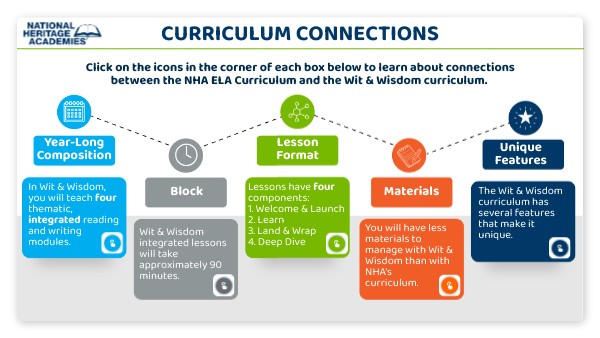 Click on the icons in the corner of each box below to learn about connections between the NHA ELA Curriculum and the Wit & Wisdom curriculum.