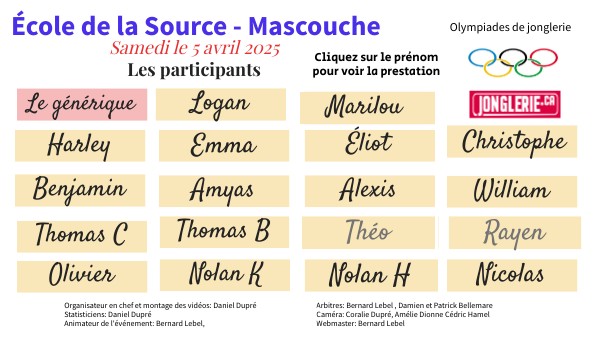 Organisateur en chef et montage des vidéos: Daniel Dupré Statisticiens: Daniel Dupré Animateur de l'événement: Bernard Lebel,