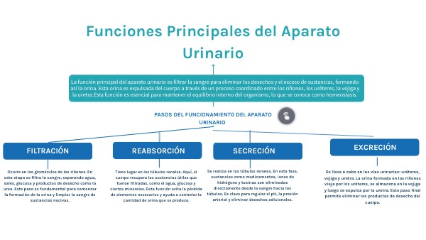 La función principal del aparato urinario es filtrar la sangre para eliminar los desechos y el exceso de sustancias, formando así la orina. Esta orina es expulsada del cuerpo a través de un proceso coordinado entre los riñones, los uréteres, la vejiga y la uretra.Esta función es esencial para mantener el equilibrio interno del organismo, lo que se conoce como homeostasis.