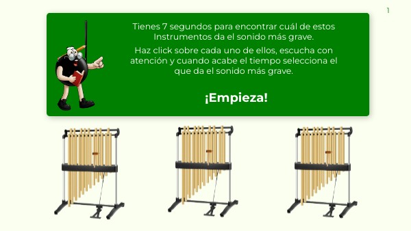 Tienes 7 segundos para encontrar cuál de estos Instrumentos da el sonido más grave. Haz click sobre cada uno de ellos, escucha con atención y cuando acabe el tiempo selecciona el que da el sonido más grave.