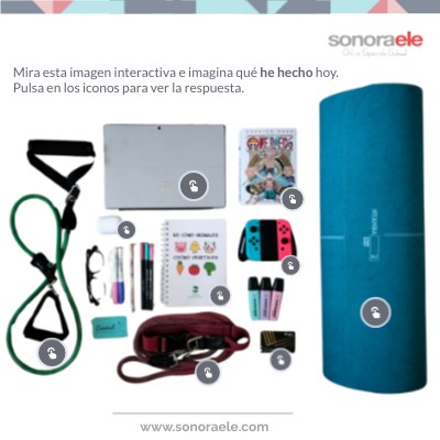 Mira esta imagen interactiva e imagina qué he hecho hoy. Pulsa en los iconos para ver la respuesta.