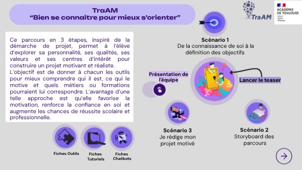 Ce parcours en 3 étapes, inspiré de la démarche de projet, permet à l’élève d’explorer sa personnalité, ses qualités, ses valeurs et ses centres d’intérêt pour construire un projet motivant et réaliste. L’objectif est de donner à chacun les outils pour mieux comprendre qui il est, ce qui le motive et quels métiers ou formations pourraient lui correspondre. L’avantage d’une telle approche est qu’elle favorise la motivation, renforce la confiance en soi et augmente les chances de réussite scolaire et professionnelle.