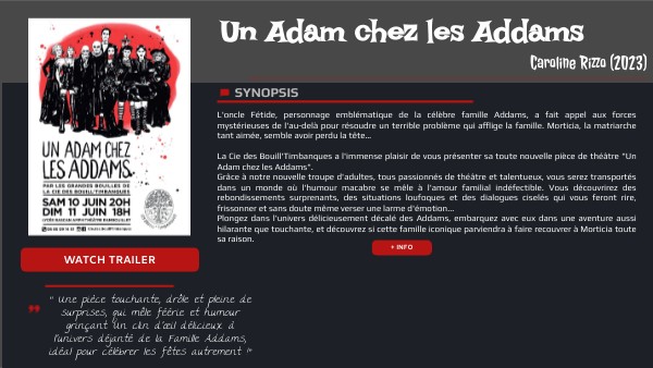 L'oncle Fétide, personnage emblématique de la célèbre famille Addams, a fait appel aux forces mystérieuses de l'au-delà pour résoudre un terrible problème qui afflige la famille. Morticia, la matriarche tant aimée, semble avoir perdu la tête… La Cie des Bouill'Timbanques a l'immense plaisir de vous présenter sa toute nouvelle pièce de théâtre "Un Adam chez les Addams". Grâce à notre nouvelle troupe d'adultes, tous passionnés de théâtre et talentueux, vous serez transportés dans un monde où l'humour macabre se mêle à l'amour familial indéfectible. Vous découvrirez des rebondissements surprenants, des situations loufoques et des dialogues ciselés qui vous feront rire, frissonner et sans doute même verser une larme d'émotion... Plongez dans l'univers délicieusement décalé des Addams, embarquez avec eux dans une aventure aussi hilarante que touchante, et découvrez si cette famille iconique parviendra à faire recouvrer à Morticia toute sa raison.