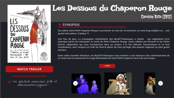 Qui aidera notre Petit Chaperon Rouge à surmonter sa crise de la trentaine: un vieux loup enjôleur ou … une grand mère pleine d'ardeur ?! Une fois de plus, La Compagnie rambolitaine des Bouill’Timbanques a réalisé son adaptation d'un classique parmi les classiques, le conte du Petit Chaperon Rouge, rendu célèbre par Perrault et les frères Grimm, adaptation qui vous transportera dans un univers à la fois délirant, humoristique et un brin moralisateur, avec toujours en toile de fond le plaisir de faire partager des œuvres majeures au plus grand nombre. Dans cette nouvelle réécriture, les Bouill’Timbanques vous invitent à une relecture très contemporaine de ce conte tout en préservant le rouge flamboyant de notre Petit Chaperon face à de noirs loups...