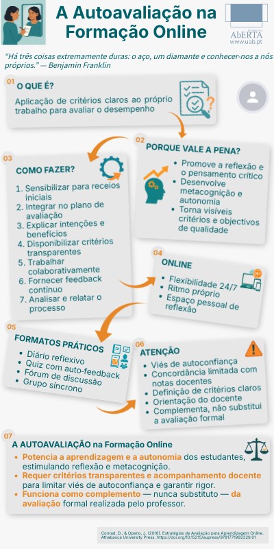 Este trabalho resume o Capítulo 9 - Autoavaliação do livro: Conrad, D., & Openo, J. (2018). Estratégias de Avaliação para Aprendizagem Online. Athabasca University Press. https://doi.org/10.15215/aupress/9781771992329.01