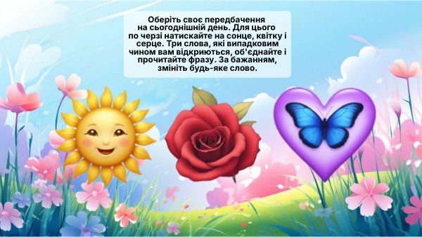 Оберіть своє передбачення на сьогоднішній день. Для цього по черзі натискайте на сонце, квітку і серце. Три слова, які випадковим чином вам відкриються, об'єднайте і прочитайте фразу. За бажанням, змініть будь-яке слово.