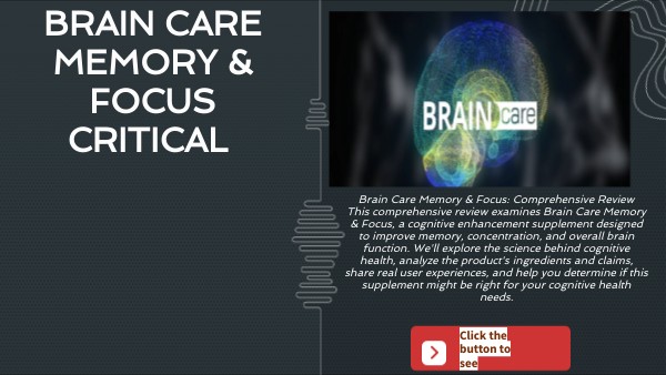 Brain Care Memory & Focus: Comprehensive Review This comprehensive review examines Brain Care Memory & Focus, a cognitive enhancement supplement designed to improve memory, concentration, and overall brain function. We'll explore the science behind cognitive health, analyze the product's ingredients and claims, share real user experiences, and help you determine if this supplement might be right for your cognitive health needs.
