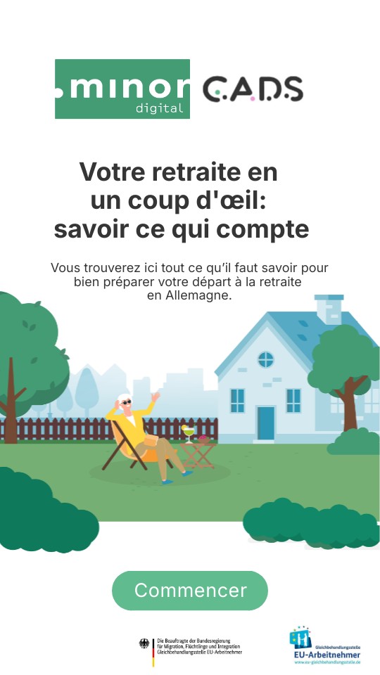 Pour toucher la retraite, il faut avoir cotisé au moins 5 ans à l’assurance retraite. Les citoyen·nes de l’UE peuvent également y accéder. Moins de 5 ans en Allemagne? Dans ce cas, vos cotisations seront prises en compte dans votre pays d'origine et il n'y aura pas de perte pour vous.