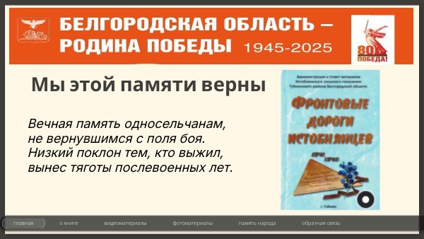 В книге "Фронтовые дороги истобнянцев" повествуется о боевых и трудовых делах односельчан в годы Великой Отечественной войны и послевоенное время. При подготовке книги использованы материалы райвоенкомата, сообщения командиров воинских подразделений, личных встреч с бывшими воинами и родственниками. На Великую Отечественную войну из села Истобное призвано 718 человек. Они участвовали в боях в качестве пехотинцев, артиллеристов, танкистов, миномётчиков, связистов, сапёров, медработников. В боях за Родину, воины-односельчане показали мужество, отвагу и воинскую доблесть. Многие из них приняли первые удары немецко-фашистских захватчиков: участвовали в обороне Москвы и Ленинграда, защищали и освобождали землю родной Белгородчины. Как освободители пришли в страны Восточной Европы и как победители в Германию. 480 человек не вернулись с поля боя. Их память поимённо увековечена на памятнике -мемориале в с. Истобное. В память о каждом погибщем воине посажено дерево. Эта книга ещё одно напоминание о тех, кто остался на полях сражений и кто всем смертям на зло остался вживых.