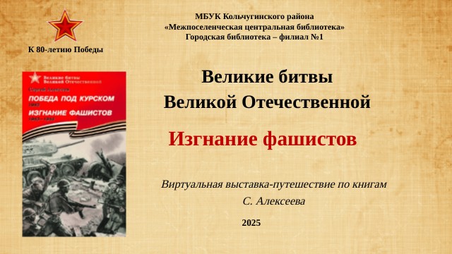 Источники: https://img.labirint.ru/images/upl/descripts/pic_1532425719.png – портрет С. Алексеева https://ru.wikipedia.org/wiki/%D0%90%D0%BB%D0%B5%D0%BA%D1%81%D0%B5%D0%B5%D0%B2,_%D0%A1%D0%B5%D1%80%D0%B3%D0%B5%D0%B9_%D0%9F%D0%B5%D1%82%D1%80%D0%BE%D0%B2%D0%B8%D1%87_(%D0%BF%D0%B8%D1%81%D0%B0%D1%82%D0%B5%D0%BB%D1%8C) https://avatars.mds.yandex.net/i?id=1fc6508497b02b1fb125cf5190ba5d64_l-5245376-images-thumbs&n=13 https://img2.akspic.ru/crops/2/4/1/9/0/109142/109142-korichnevyj_cvet-drevesina-tekst-tekstura-morilka-2560x1440.jpg - фон презентации https://avatars.mds.yandex.net/get-mpic/4762868/img_id1724613164011192074.jpeg/orig - красная звезда Таборко В.А. Летопись Великой Отечественной. 1941-1945: Краткая иллюстрированная история для юношества. Предисл. П. А. Жилина. – М.: Мол. Гвардия, 1985. – 334с., ил. Алексеев С.П. Победа под Курском. 1943. Изгнание фашистов. 1943-1944 : рассказы для детей / Сергей Алексеев; худож. А.Лурье. – М. :Дет.лит., 2013с.: ил. – (Великие битвы Великой Отечественной). Подвиг народа: Памятники Великой Отеч. войны, 1941-1945гг./ Сост. и общ. ред. В. А. Голикова. – М.: Политиздат, 1980. – 318с., ил. https://iknigi.net/books_files/online_html/135130/i_061.jpg - к рассказу Восточный вал https://iknigi.net/books_files/online_html/135130/i_063.jpg - к рассказу Первые https://iknigi.net/books_files/online_html/135130/i_077.jpg - к рассказу Горы https://iknigi.net/books_files/online_html/135130/i_084.jpg - к рассказу «Багратион» https://iknigi.net/books_files/online_html/135130/i_086.jpg - к рассказу Два процента https://iknigi.net/books_files/online_html/135130/i_097.jpg - к рассказу Лепель https://iknigi.net/books_files/online_html/174070/i_029.jpg - к рассказу Доложить! https://iknigi.net/books_files/online_html/135130/i_109.jpg - к рассказу Жало https://www.prlib.ru/sites/default/files/book_preview/07f909d5-76ca-45ff-9c8d-6a5aafb5de5e/218065_doc1_AB029FF0-38BF-40DA-AD60-9516A3D55FB7.jpg - плакат