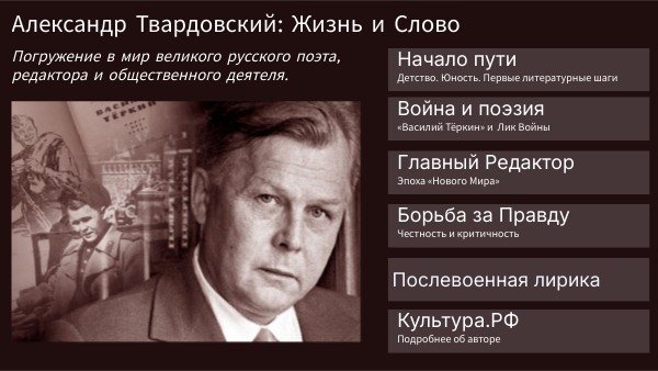Творчество Александра Трифоновича Твардовского пронизано гражданской позицией — осознанием ответственности перед Родиной, народом и историей. При этом Твардовский стремился к честности и правдивому изображению действительности.