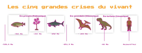 La crise du Crétacé-Paléogène, sans doute la plus connues, correspond à l’extinction des grands reptiles (dont certain dinosaures). Elle concorde avec un épisode volcanique majeur, au Dekkan (Inde) auquel s’ajoute la chute d’un astéroïde dans la péninsule du Yucatan (Mexique) qui ont impacté toute la planète.