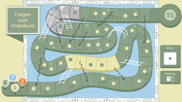 Die Spieler beginnen mit einer Spielfigur im Startfeld und würfeln abwechselnd. Die Spielfiguren bewegen sich entsprechend der Nummerierung auf dem Spielbrett in aufsteigender Reihenfolge. Wenn eine Spielerin auf einem Feld mit einem Punkt landet, dann soll sie eine Frage zum Praktikum (siehe Fragenstapel) ehrlich beantworten. Kommt sie am Ende eines Zuges auf einem Feld, an dem eine Leiter beginnt, bewegt sie sich nach oben zu dem Feld, an dem sie endet. Wenn sie hingegen auf einem Feld landet, an dem der Schwanz einer Schlange beginnt, bewegt er sich nach unten zu dem Feld, an dem ihr Kopf endet.