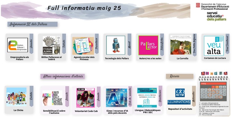 7 - Jornades d'Emprenedoria 8 - Trobada de bitlles Pallareses 15 - Final CLVA / Presentació Agenda Escolar Pirineus 16 - Mercat de Tecnologia dels Pallars 21 al 26 - Autors/res a les aules30 - Cantada La Clicka31 - Fira La Carrulla