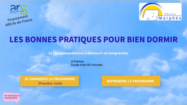 Bienvenue, Cet atelier est organisé en 4 sessions. Dans chaque session vous trouverez un quiz de connaissances et des videos explicatives suivies de recommandations pour améliorer votre sommeil. Vous avez la possibilité de choisir les sessions en fonction de celles qui vous intéressent le plus. Nous vous recommandons néanmoins de les suivre dans l'ordre.