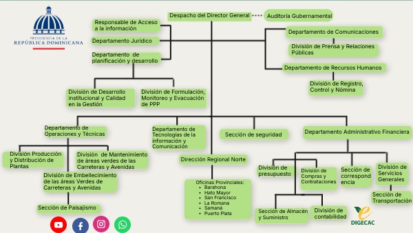 Div. de Mantenimiento de Áreas verdes de Carreteras y Avenidas. Encargado (a) de Departamento:Rosa Cesarina Gonell Normativa: Resolución DIGECAC-01/2021, que aprueba el Manual de Organización y Funciones refrendada por el MAP. Naturaleza de la Unidad: Sustantiva. Dependencia: Departamento Técnico. Objetivo General: Dirigir, coordinar y supervisa el mantenimiento y reparación de áreas verdes, carreteras y avenidas del país.