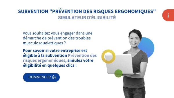 Pour savoir si votre entreprise est éligible à la subvention Prévention des risques ergonomiques, simulez votre éligibilité en quelques clics !