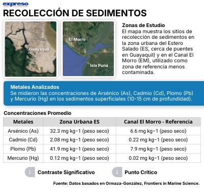 Zonas de Estudio El mapa muestra los sitios de recolección de sedimentos en la zona urbana del Estero Salado (ES, cerca de puentes en Guayaquil) y en el Canal El Morro (EM), utilizado como zona de referencia menos contaminada.