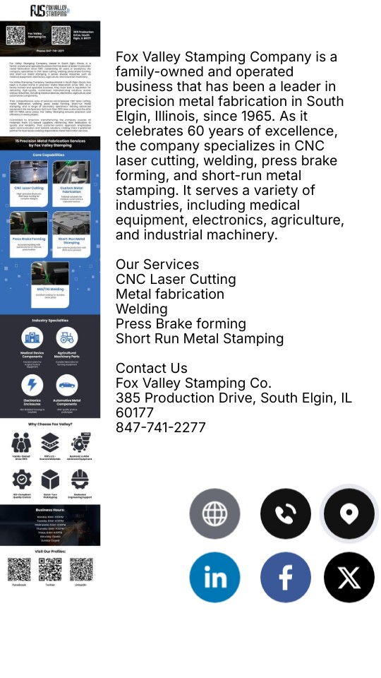 Fox Valley Stamping Company is a family-owned and operated business that has been a leader in precision metal fabrication in South Elgin, Illinois, since 1965. As it celebrates 60 years of excellence, the company specializes in CNC laser cutting, welding, press brake forming, and short-run metal stamping. It serves a variety of industries, including medical equipment, electronics, agriculture, and industrial machinery.