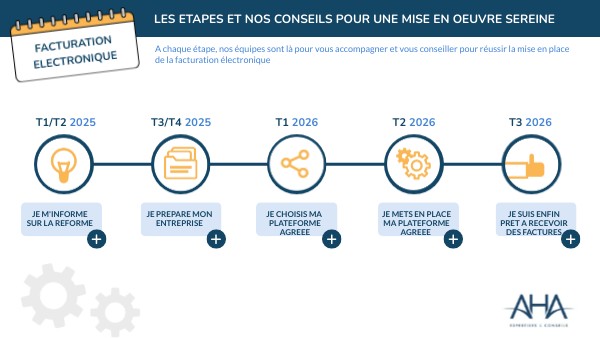 Fort de notre expérience, chez AHA, nous sommes convaincus que la réussite de la mise en place de la facturation électronique passe obligatoirement par l'adhésion et l'accompagnement de vos équipes pour créer un avantage concurrentiel durable.Nos équipes vous accompagnent pour mener cette conduite du changement au sein de votre oragnisation.