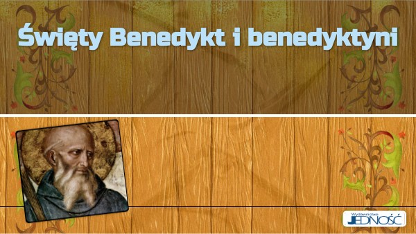 Na kolejnym slajdzie przeczytamy z podziałem na role wywiad ze św. Benedyktem. Osoby wsytępujące: św. Benedykt prowadzący