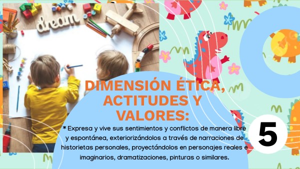 * Expresa y vive sus sentimientos y conflictos de manera librey espontánea, exteriorizándolos a través de narraciones de historietas personales, proyectándolos en personajes reales e imaginarios, dramatizaciones, pinturas o similares.
