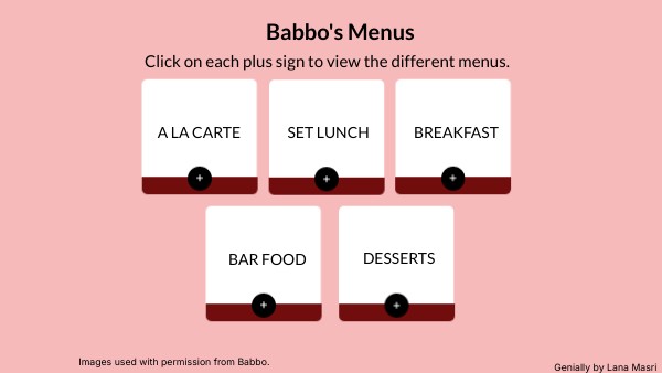 Enjoy a relaxed lunch at Babbo with a curated menu of Italian classics, available Monday to Friday from noon to 3 p.m.
