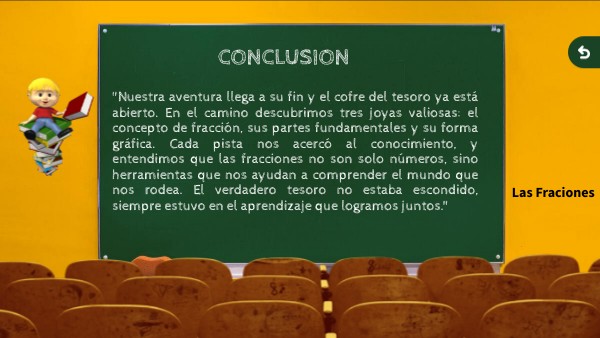 "Nuestra aventura llega a su fin y el cofre del tesoro ya está abierto. En el camino descubrimos tres joyas valiosas: el concepto de fracción, sus partes fundamentales y su forma gráfica. Cada pista nos acercó al conocimiento, y entendimos que las fracciones no son solo números, sino herramientas que nos ayudan a comprender el mundo que nos rodea. El verdadero tesoro no estaba escondido, siempre estuvo en el aprendizaje que logramos juntos."