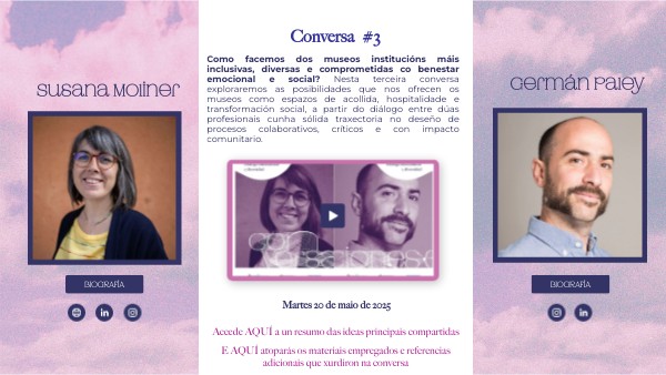 Como facemos dos museos institucións máis inclusivas, diversas e comprometidas co benestar emocional e social? Nesta terceira conversa exploraremos as posibilidades que nos ofrecen os museos como espazos de acollida, hospitalidade e transformación social, a partir do diálogo entre dúas profesionais cunha sólida traxectoria no deseño de procesos colaborativos, críticos e con impacto comunitario.