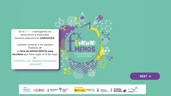 En el INMA investigamos en nanociencia y materiales.Nuestra sede está en ZARAGOZA. ¿Quieres conocer a los equipos finalistas de la Feria de NANOCIENCIA para escolares que tiene lugar el 15 de mayo en el Mobility City Zaragoza (Fundación Ibercaja)?