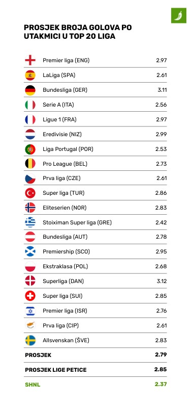 PROSJEK BROJA GOLOVA PO UTAKMICI U TOP 20 LIGA