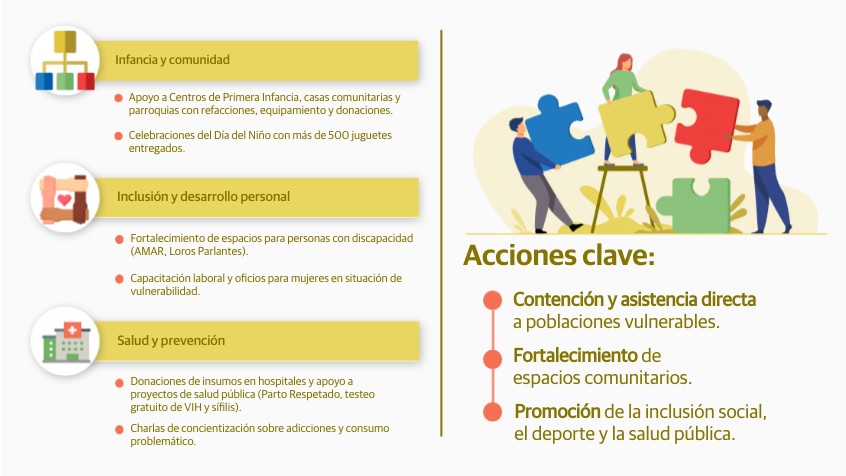 Apoyo a Centros de Primera Infancia, casas comunitarias y parroquias con refacciones, equipamiento y donaciones.
