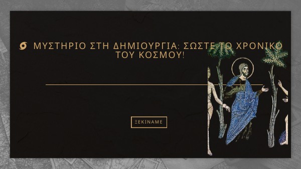Μήνυμα προς τους Εξερευνητές της Δημιουργίας:Καλώς ήρθατε, Ταξιδιώτες του Χρόνου! Μια ανεπανόρθωτη αναστάτωση έχει συγκλονίσει τη Μνήμη του Κόσμου! Κάποιος ανακάτεψε τις μέρες της Δημιουργίας, έχασε το νήμα της ιστορίας του ανθρώπου και κλείδωσε τα μυστικά του Η Ιερή Αποστολή σας είναι σαφής: Να ταξιδέψετε από το πρώτο φως έως την πτώση του ανθρώπου.Να ανακαλύψετε τι πραγματικά συνέβη στις αρχές του κόσμου. Να ενώσετε τα κομμάτια της χαμένης αλήθειας. Για να το πετύχετε πρέπει: Να λύσετε γρίφους,Να αναγνωρίσετε εικόνες, Να συνδέσετε γεγονότα,Και να επαναφέρετε το Χρονικό της Δημιουργίας! Προσοχή! Ο χρόνος κυλάει, και μόνο αν δουλέψετε με προσοχή, λογική και πίστη, θα σώσετε την ιστορία της ανθρωπότητας! Καλή τύχη, Φύλακες της Δημιουργίας!