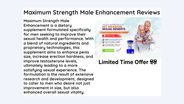 Maximum Strength Male Enhancement is a dietary supplement formulated specifically for men seeking to improve their sexual health and performance. With a blend of natural ingredients and proprietary technologies, this supplement aims to enhance penis size, increase erection hardness, and improve testosterone levels, ultimately leading to a more satisfying sexual experience. The formulation is the result of extensive research and development, designed to cater to men who desire not just improvement in size, but also enhanced overall sexual vitality.