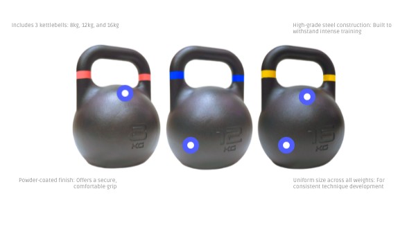 Includes 3 kettlebells: 8kg, 12kg, and 16kg