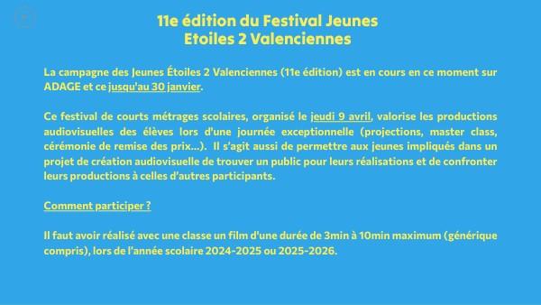 La campagne des Jeunes Étoiles 2 Valenciennes (11e édition) est en cours en ce moment sur ADAGE et ce jusqu'au 30 janvier. Ce festival de courts métrages scolaires, organisé le jeudi 9 avril, valorise les productions audiovisuelles des élèves lors d'une journée exceptionnelle (projections, master class, cérémonie de remise des prix…). Il s’agit aussi de permettre aux jeunes impliqués dans un projet de création audiovisuelle de trouver un public pour leurs réalisations et de confronter leurs productions à celles d’autres participants. Comment participer ? Il faut avoir réalisé avec une classe un film d'une durée de 3min à 10min maximum (générique compris), lors de l’année scolaire 2024-2025 ou 2025-2026.