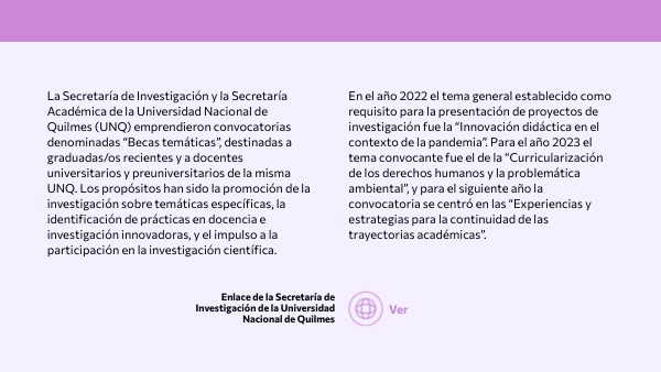 La Secretaría de Investigación y la Secretaría Académica de la Universidad Nacional de Quilmes (UNQ) emprendieron convocatorias denominadas “Becas temáticas”, destinadas a graduadas/os recientes y a docentes universitarios y preuniversitarios de la misma UNQ. Los propósitos han sido la promoción de la investigación sobre temáticas específicas, la identificación de prácticas en docencia e investigación innovadoras, y el impulso a la participación en la investigación científica.