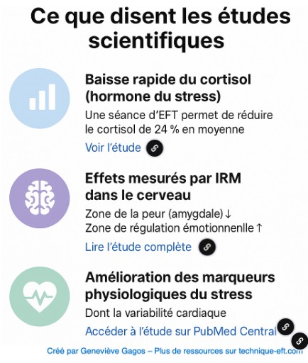 Cette infographie interactive présente 3 études scientifiques sur l’EFT (Emotional Freedom Techniques) et ses effets mesurés sur le stress. Découvrez l’impact de l’EFT sur le cortisol, le cerveau et les marqueurs physiologiques. Une ressource claire, sourcée et accessible créée par Geneviève Gagos