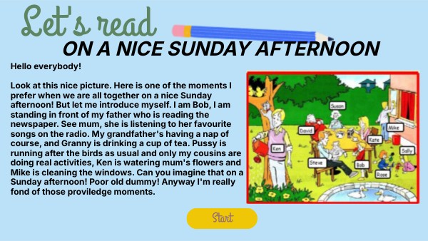 Hello everybody! Look at this nice picture. Here is one of the moments I prefer when we are all together on a nice Sunday afternoon! But let me introduce myself. I am Bob, I am standing in front of my father who is reading the newspaper. See mum, she is listening to her favourite songs on the radio. My grandfather's having a nap of course, and Granny is drinking a cup of tea. Pussy is running after the birds as usual and only my cousins are doing real activities, Ken is watering mum's flowers and Mike is cleaning the windows. Can you imagine that on a Sunday afternoon! Poor old dummy! Anyway I'm really fond of those proviledge moments.