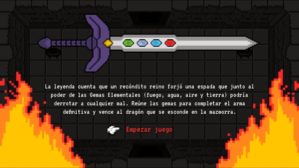 La leyenda cuenta que un recóndito reino forjó una espada que junto al poder de las Gemas Elementales (fuego, agua, aire y tierra) podría derrotar a cualquier mal. Reúne las gemas para completar el arma definitiva y vence al dragón que se esconde en la mazmorra.