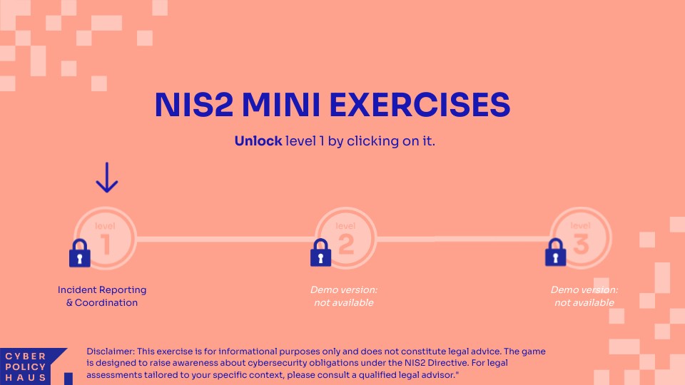 Disclaimer: This exercise is for informational purposes only and does not constitute legal advice. The game is designed to raise awareness about cybersecurity obligations under the NIS2 Directive. For legal assessments tailored to your specific context, please consult a qualified legal advisor."