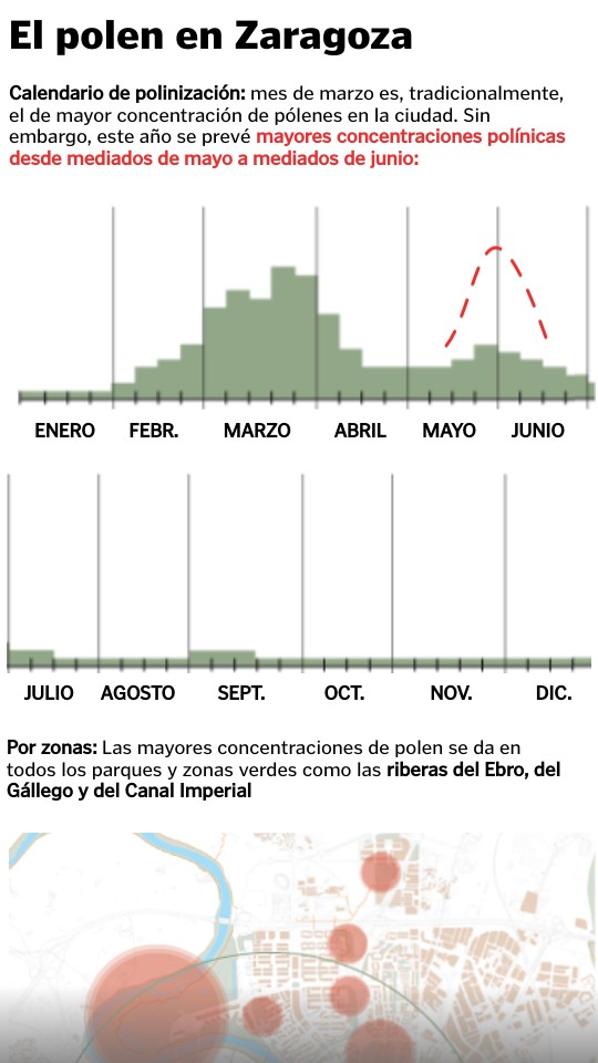 Por zonas: Las mayores concentraciones de polen se da en todos los parques y zonas verdes como las riberas del Ebro, del Gállego y del Canal Imperial