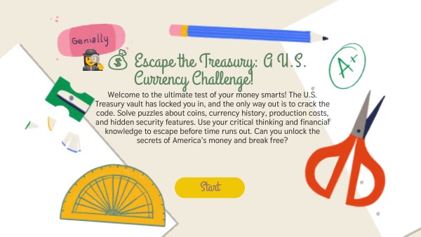 Welcome to the ultimate test of your money smarts! The U.S. Treasury vault has locked you in, and the only way out is to crack the code. Solve puzzles about coins, currency history, production costs, and hidden security features. Use your critical thinking and financial knowledge to escape before time runs out. Can you unlock the secrets of America’s money and break free?