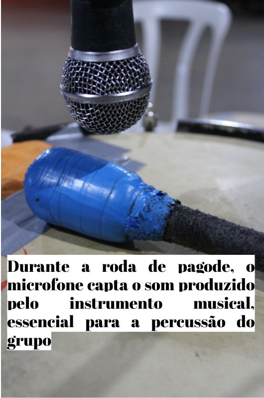 Durante a roda de pagode, o microfone capta o som produzido pelo instrumento musical, essencial para a percussão do grupo