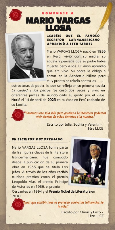 Mario VARGAS LLOSA nació en 1936 en Perú; vivió con su madre, su abuela y pensaba que su padre había muerto pero a los 11 años aprendió que era vivo. Su padre le obligó a entrar en la Academia Militar pero muy pronto se rebeló contra las