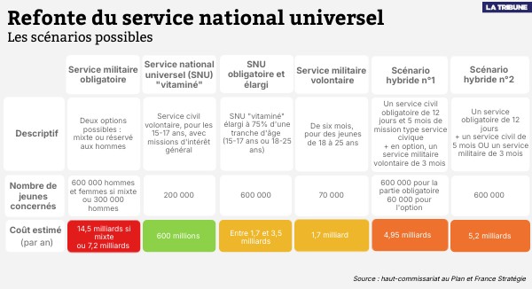 Un service civil obligatoire de 12 jours et 5 mois de mission type service civique + en option, un service militaire volontaire de 3 mois