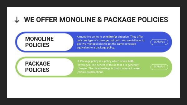 A monoline policy is an either/or situation. They offer only one type of coverage, not both. You would have to get two monopolicies to get the same coverage equivalent to a package policy.